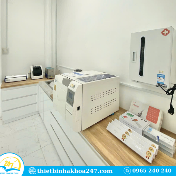- Combo thiết bị vô trùng đồng bộ: Nồi hấp tiệt trùng Class B ESCO, máy chưng nước cất, máy đóng gói dụng cụ, máy tra dầu tay khoan, tủ tia cực tím.