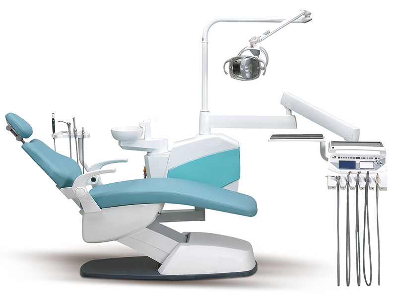 - Ghế có tích hợp đèn khám, bộ tay khoan, hút nước bọt, tay xịt và hệ thống điều khiển