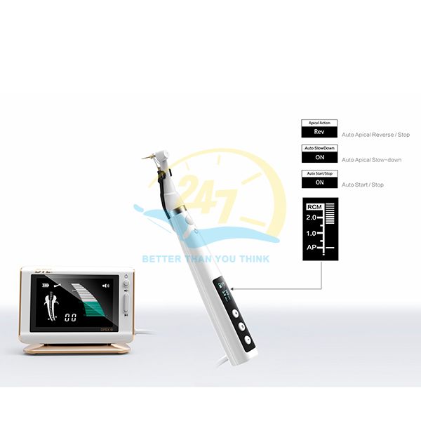 - Máy có khả năng đảo chiều quay khi đến gần đỉnh chóp, ngăn ngừa gãy dụng cụ và các biến chứng không mong muốn khác. Chức năng này giúp bảo vệ các dụng cụ nội nha khỏi bị hỏng hóc, giảm thiểu chi phí thay thế và sửa chữa cho phòng khám.